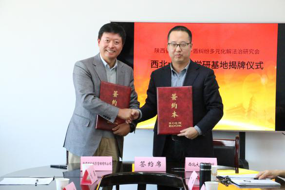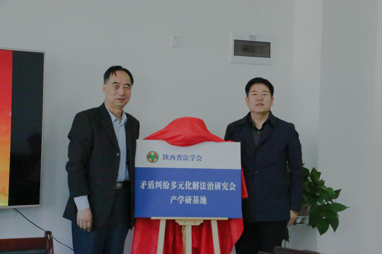 会上,陕西时代投资管理有限公司董事长曲非与院长王思锋共同签署校企全面合作协议,陕西省矛盾纠纷多元化解法治研究会董建良会长与党委书记李一凡共同为产学研基地揭牌。
