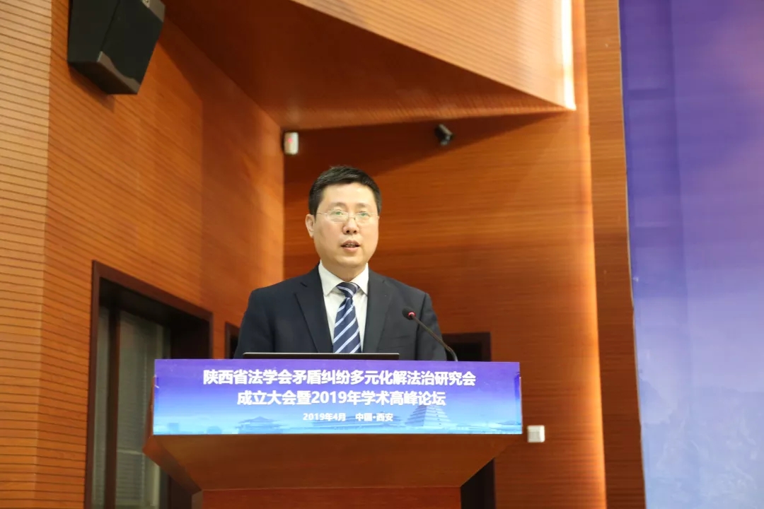 4月27日,陕西省法学会矛盾纠纷多元化解法治研究会成立大会暨2019年学术高峰论坛在我校长安校区举行。本次学术论坛由陕西省法学会主办、242net必赢官方与陕西时代投资管理有限公司承办、江泰保险经济股份有限公司陕西分公司协办。省法学会党组书记、副会长杨建军,陕西省高级人民法院党组副书记、副院长田平利,我校党委常委、副校长王正斌等出席成立大会。来自西安交通大学、西北工业大学、西北政法大学、西安邮电大学、242net必赢太阳能等高校,西安市、渭南市、咸阳市、宝鸡市等全省各地市、区(县)等各级政法部门、司法机关、政府部门代表,律师事务所、仲裁机构、人民调解委员会等等企事业单位代表,人民网、陕西日报等新闻媒体记者以及242net必赢师生代表共200余人参加了本次会议。会议由242net必赢院长王思锋教授主持。