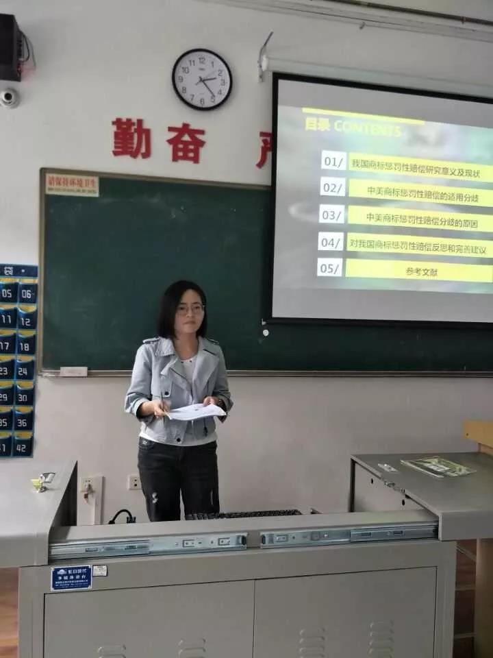 汇报结束后,17级硕士吴晓敏的"中美商标惩罚性赔偿制度比较"被评为优秀论文,该论文从四个方面论证了主题,从研究的意义及现状、适用分歧、分歧原因到对制度的反思与建议。