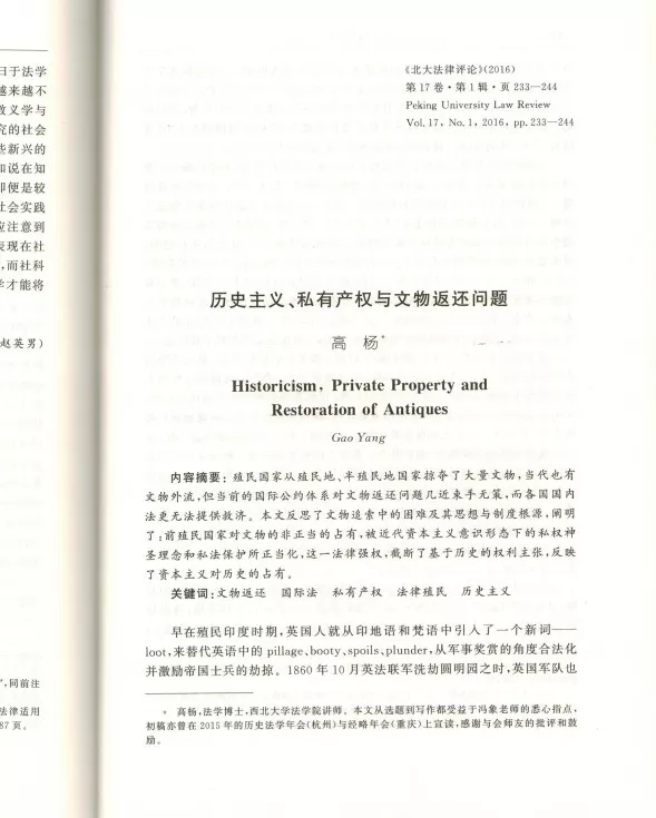 我院青年教师高杨发表的论文《历史主义、私有产权与文物返还问题》被《中国社会科学文摘》2018第1期转载。