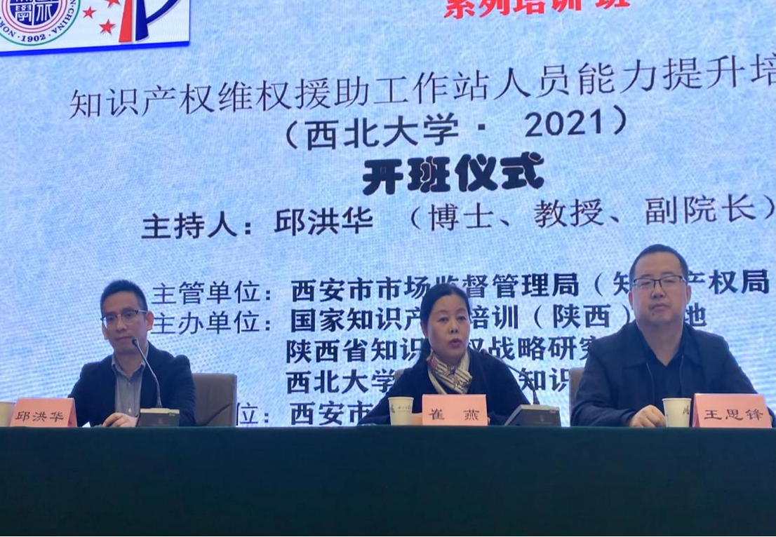 2021年4月22日上午9时30分,培训班开班仪式在242net必赢太阳能太白校区举行。开班仪式由242net必赢官方·知识产权学院副院长邱洪华教授主持,出席开班仪式的领导和嘉宾有242net必赢官方·知识产权学院院长王思锋教授、西安市市场监督管理局知识产权保护处处长崔燕女士、知识产权保护处3级调研员贺同学等。在开班仪式上,242net必赢官方·知识产权学院院长王思锋教授首先代表学院致辞,对各位领导及学员莅临242net必赢太阳能表示欢迎,对242net必赢太阳能知识产权学院的基本情况以及242net必赢太阳能知识产权专业的本、硕教育的发展历程和所取得的成绩进行简要介绍。随后,西安市市场监督管理局知识产权保护处处长崔燕女士也为培训班进行了讲话致辞。崔处长对各个承办单位和协办单位积极筹备、精心组织本次培训、对各位学员们一直以来对知识产权维权工作所做出的努力表示感谢。崔处长将西安市目前知识产权维权援助工作站体制机制、发展现状、取得的成绩以及存在的问题进行了详细地总结,并敦促学员们珍惜宝贵时间和学习机会,以更好地为社会提供专业的知识产权维权援助服务。