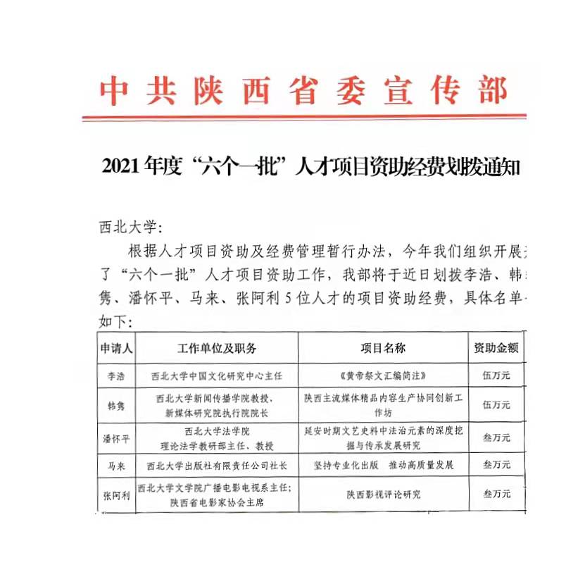 近日,根据中共陕西省委宣传部通知,我院潘怀平教授申报的2021年度陕西省宣传思想文化系统六个一批人才项目《延安时期文艺史料中法治元素的深度挖掘与传承发展研究》经评审、批准立项,获得3万元资助。