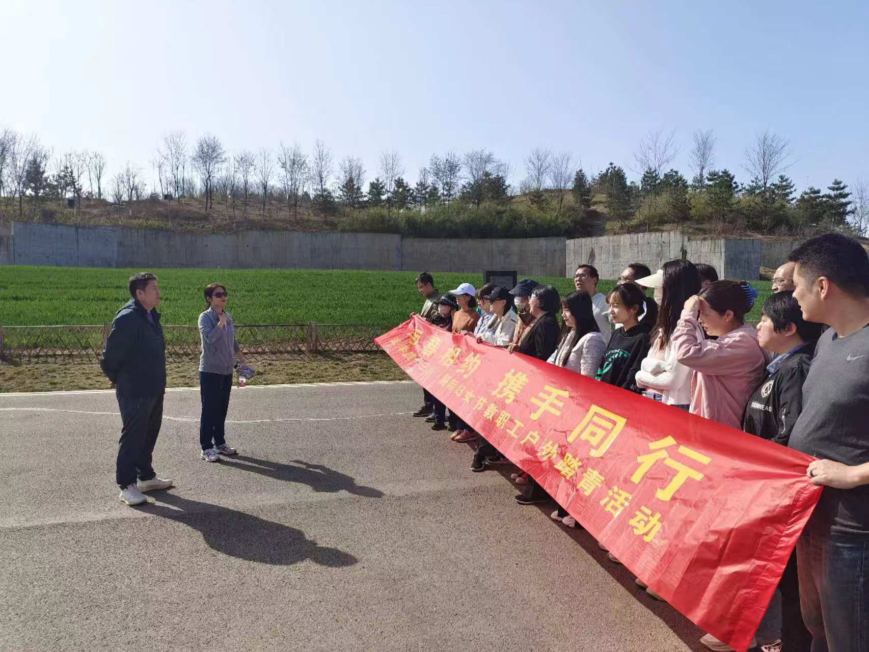 天气晴朗,气温微热,教职工们有的已经脱下了外套,不放过任何一个与春天亲密接触的机会,每个人脸上都洋溢着甜美灿烂的笑容,仿佛在追赶春的脚步。