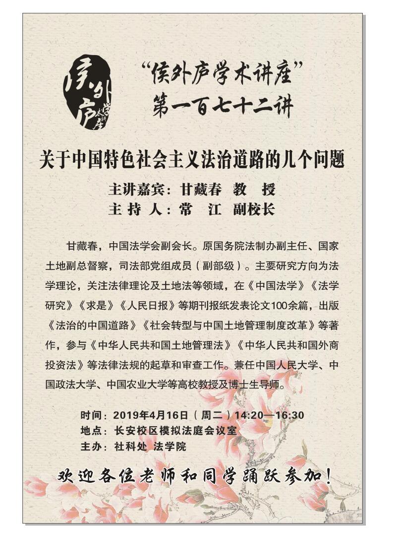 讲座通知:“侯外庐学术讲座”第172讲——关于中国特色社会主义法治道路的几个问题