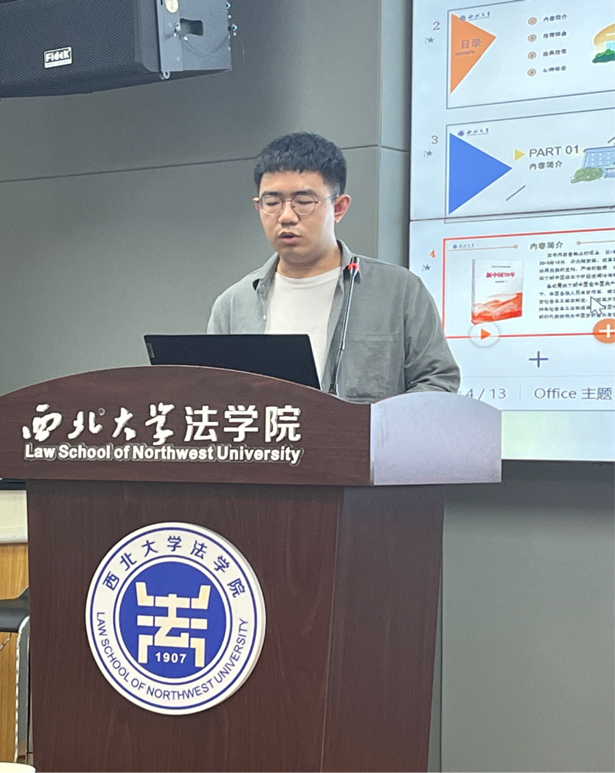 2022级法学硕士班郑丁昶同学分享的书目是《新中国七十年》,主要从时间线入手,生动展现了新中国在中国共产党坚强领导下,全国各族人民当家作主,建立、巩固和探索社会主义基本制度;在改革开放中找到中国特色社会主义正确道路;在中国特色社会主义新时代实现伟大中国梦的奋斗与奋进历程。之后,郑丁昶同学从建国以来民生保障方面入手,向大家分享了三个阶段以来国家是如何保障民生,以及保障民生所取得的成果。