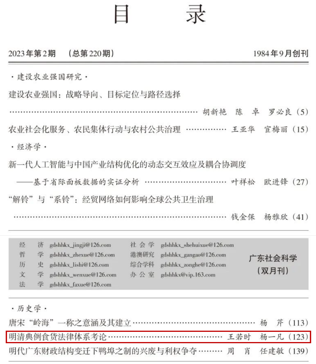 近日,我院王若时老师与杨一凡教授共同撰写的论文《明清典例食货法律体系考论》被《中国社会科学文摘》2023年第7期转载,该论文原发表于《广东社会科学》2023年第2期。